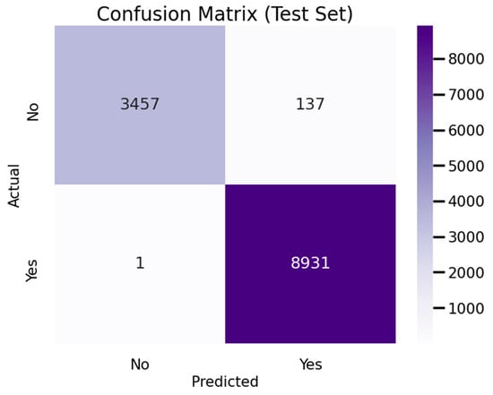 Figure 10 shows a graph showing the confusion matrix of the pinnacle model. The matrix displays precise analysis regarding how well the model predicts stadium evacuation fire alarms. The model achieved 3457 accurate predictions for cases with no fire alarm activity and 8931 hits for instances with fire alarm triggers. The model generated 137 incorrect positive predictions that showed fire alarm activation when no such event occurred but correctly identified only 8931 actual fire alarms out of the examined cases.