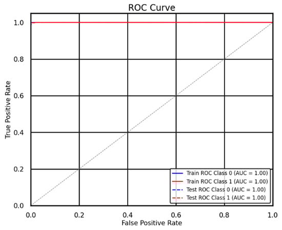 Figure 11. The curve shows a close-to-perfect threshold between positive and negative examples because the model obtained an AUC value approaching complete separation. The model demonstrates a high capability to recognize fire and non-fire events, so it produces few mistakes during classification. When the curve rises steeply from the beginning, it shows both a very low false positive rate (FPR) and a high actual positive rate (TPR). The model demonstrates high reliability during emergencies because it accurately detects fire incidents while avoiding unnecessary false alarms. EvacuNet performs better than random chance because its curve surpasses the diagonal gray line for both the train and test sets on both classes.