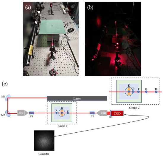 Experimental setup diagram: (a) shows the experimental setup under illuminated conditions, (b) depicts the setup for speckle acquisition in the dark, and (c) presents a top-view schematic of the apparatus. The first experimental configuration is labeled “Group 1” in a dashed box, while the second configuration is labeled “Group 2”, with all other components remaining the same.