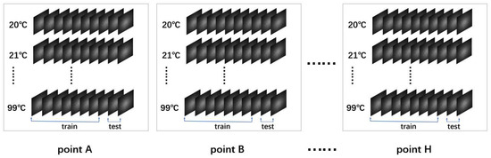 In the experiment, speckle images were captured for each sampling point. For instance, at point A, 10 speckle images were first captured continuously at room temperature (20 °C). Subsequently, another 10 images were captured at 21 °C, and this process was repeated at 1 °C intervals up to 99 °C. A total of 10 speckle images were captured at each temperature, resulting in 80 temperature points and a total of 800 speckle images. Similarly, speckle images were captured at points B, C, D, E, F, G, and H within the temperature range of 20 °C to 99 °C.