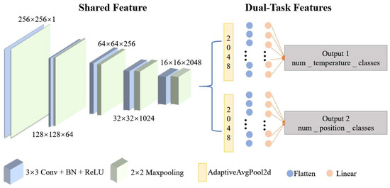 The model adopts a dual-task learning framework for separate temperature and position predictions. In this framework, the feature extraction layers are shared, which not only improves the model’s performance on both tasks but also reduces the computational load. Specifically, the temperature prediction task outputs 80 classes (corresponding to 80 temperature levels), and the position prediction task varies depending on the experimental setup. In the first group of experiments, it outputs 3 position categories, and in the second group, it outputs 5 position categories.