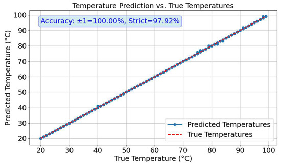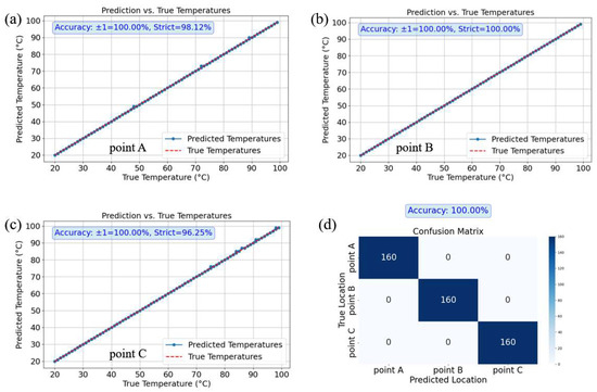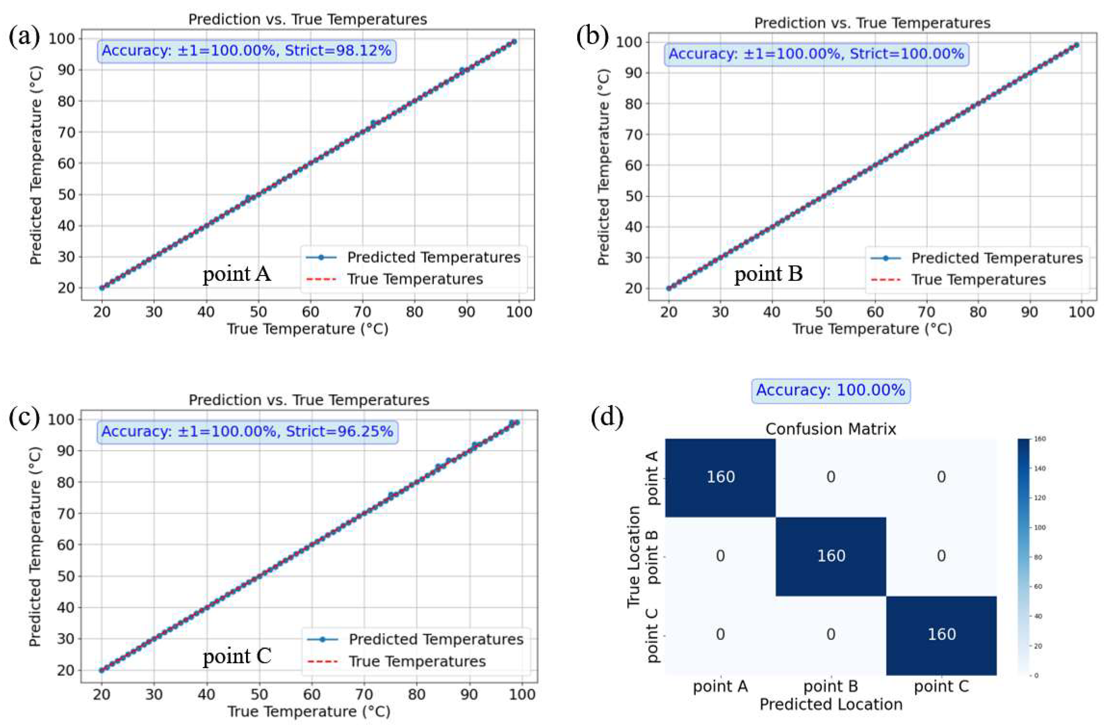 In the dual-task prediction of temperature and position, the temperature prediction results are shown in Figure 7. The average accuracy of temperature prediction across the three points (A, B, and C) was calculated, revealing a tolerant accuracy of 100% and a strict accuracy of 97.92%. Meanwhile, the position prediction results remained consistent with those in Figure 5d, maintaining an accuracy of 100%.