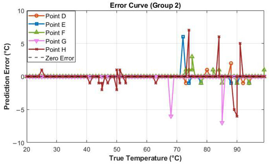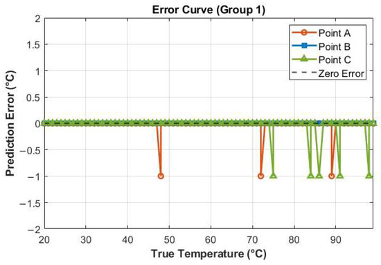 Given the minimal discrepancy between the predicted and set temperatures, and the strong linear correlation between them, we have plotted the corresponding error curves, as shown in Figure 6. The error values were calculated by subtracting the true temperature values from the predicted temperature values. In the figure, the error curve for Heating Point A is represented by orange circular markers. During the prediction process, Heating Point A exhibited prediction errors of 1 °C at three temperature points, namely 48 °C, 72 °C, and 89 °C. The predicted values at these points were each 1 °C lower than the true values, hence the negative values on the error curve. In contrast, the error curve for the heating point denoted by blue square markers indicates zero error, meaning the predicted temperatures were identical to the true temperatures. The green triangular curve, representing another heating point, shows prediction errors of 1 °C at five temperature points: 75 °C, 84 °C, 86 °C, 91 °C, and 98 °C. The predicted values at these points were also each 1 °C lower than the true values.