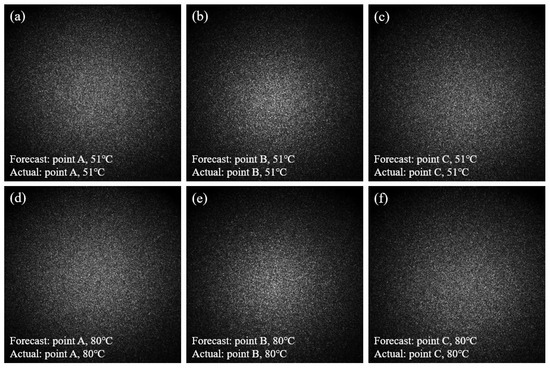 Speckle images and their temperature and position prediction results for Group 1. (a) shows that the predicted location of the speckle pattern is Point A, with a predicted temperature of 51 °C; (b) shows that the predicted location of the speckle pattern is Point B, with a predicted temperature of 51 °C; (c) shows that the predicted location of the speckle pattern is Point C, with a predicted temperature of 51 °C; (d) shows that the predicted location of the speckle pattern is Point A, with a predicted temperature of 80 °C; (e) shows that the predicted location of the speckle pattern is Point B, with a predicted temperature of 80 °C; (f) shows that the predicted location of the speckle pattern is Point C, with a predicted temperature of 80 °C.