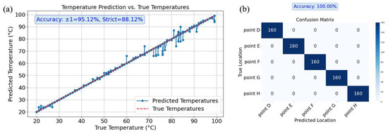 In the dual-task prediction of temperature and position, the average accuracy of temperature prediction across the five points (D, E, F, G, and H) was calculated, as shown in Figure 10a. The results revealed a tolerant accuracy of 95.12% and a strict accuracy of 88.12%. However, the deviation in temperature prediction increased after 70 °C. Meanwhile, the confusion matrix for position prediction (Figure 10b) shows that the position prediction accuracy remained at 100% for all points.