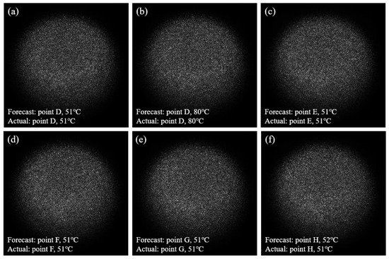 Speckle images and their temperature and position prediction results for Group 2. (a) shows that the predicted location of the speckle pattern is Point D, with a predicted temperature of 51 °C, consistent with the actual value; (b) shows that the predicted location of the speckle pattern is Point D, with a predicted temperature of 80 °C, consistent with the actual value; (c) shows that the predicted location of the speckle pattern is Point E, with a predicted temperature of 51 °C, consistent with the actual value; (d) shows that the predicted location of the speckle pattern is Point F, with a predicted temperature of 51 °C, consistent with the actual value; (e) shows that the predicted location of the speckle pattern is Point G, with a predicted temperature of 51 °C, consistent with the actual value; (f) shows that the predicted location of the speckle pattern is Point H, with a predicted temperature of 52 °C, while the actual temperature is 51 °C, resulting in an error of 1 °C.