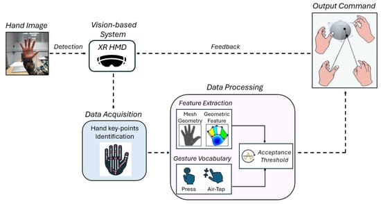 General block diagram of a vision-based hand gesture recognition NHMI implemented within XR HMDs.