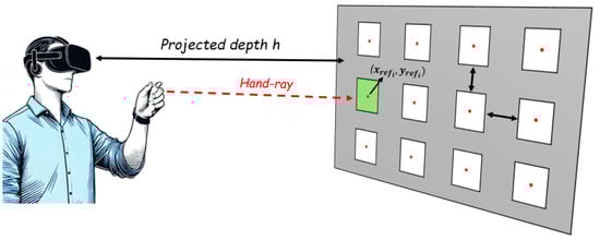The visual cue, which indicated the icon to select, was represented by a black cross that appeared on the icon itself. As previously described in Section 3.1 and Section 3.2, the coordinates selected by the user were determined by the intersection of the hand ray (depicted in Figure 3 as a red dotted line, visible to the user through the HMD) and the grid of icons.