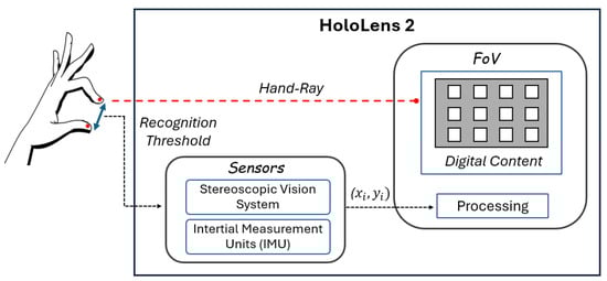 Without loss of generality, the proposed method was validated by considering the Microsoft HoloLens 2 [61] as XR HMD. Microsoft HoloLens 2 is an Optical-See-Through (OST) XR HMD, characterized by a diagonal FoV of 52°. As highlighted in Section 1, like other XR manufacturers, Microsoft does not disclose specific details on how data are processed for gesture recognition, only providing general information regarding the sensing modalities, such as the stereoscopic vision system consisting of visible light and IR cameras, along with an IMU that tracks head movement. Despite its unique features, HoloLens 2 is approaching obsolescence. However, the proposed method is designed to be adaptable to any XR HMD, with HoloLens 2 serving merely as a case study to demonstrate its applicability.