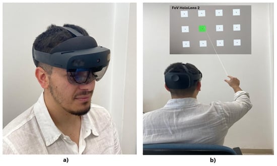 Before wearing the XR headset, all participants were clearly instructed on the task and asked to perform the finger-tapping gesture in a natural and comfortable way [65]. Participants were instructed to perform gestures with the hand clearly within the gesture frame, and to maintain a consistent forward-facing hand orientation, minimizing occlusion between thumb and index finger during the selection gesture. After that, participants wore the HoloLens 2, adjusting it to display the digital content correctly and carrying out eye calibration prior to starting the experiment in order to guarantee hologram stability [66]. Hence, they were given a brief period, approximately 3–5 min, to familiarize themselves with the system before data collection began.