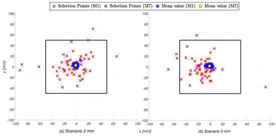With reference to the results within each threshold scenario, the results presented in the table also reveal potentially significant variability in the Euclidean distance error, both intra- and inter-individually. Figure 5 visually represents this variability. In the left image, corresponding to the scenario, the set of selection points are shown for the participant with the lowest average Euclidean distance error (the seventh) and the one with the highest (the first), along with their average values. The same information is depicted in the right image for the scenario. Notably, the participants with the best and worst Euclidean distance errors remain the same across both the and scenarios. This suggests that the intra- and inter-individual variability in content selection are consistent with the choice of different threshold values; that is, participants who tended to perform well (or poorly) under one threshold condition also exhibited similar performance under the other.