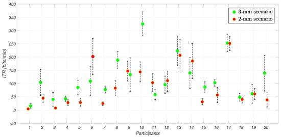 Hence, for each scenario ( mm), a number of selection cycles were chosen, each with a different random sequence of the icons to be selected. As mentioned in Section 3.2, a rest period of one minute was considered at the end of each cycle and each scenario. The entire experiment lasted approximately 40 min for each participant.