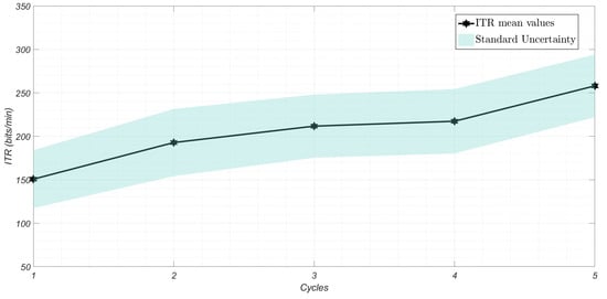 ITR values averaged over 20 participants, with standard uncertainty for each cycle in the 3 mm scenario.