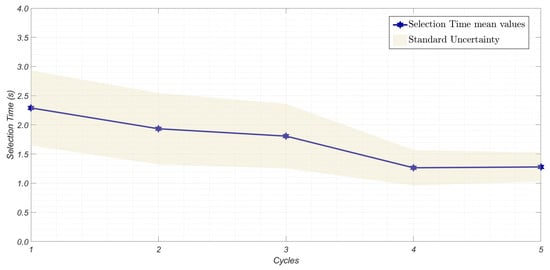 By considering each scenario separately, intra-individual variability was investigated by comparing, for each metric and each participant, the variability of the results among the acquisition cycles. As normality conditions were not satisfied, the non-parametric Friedman test was applied ( = 0.05). While for the scenario no significant variability between cycles was assessed by the test, the outcomes for indicate significant variability in terms of ITR and selection time ( < 0.01). This variability could be attributed to a more pronounced learning process by the participants over the cycles, as shown in Figure 7 and Figure 8, where the values averaged over all participants for each cycle are represented. As evident, the selection process becomes progressively faster with each cycle, allowing for the transfer of greater amounts of information.