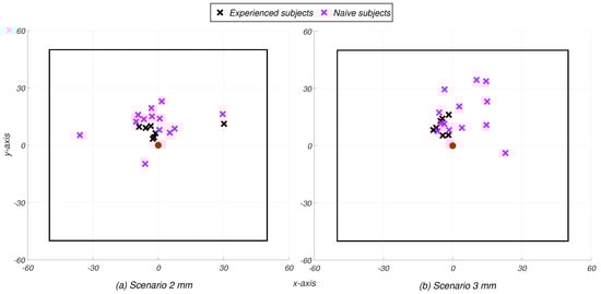 Finally, in order to investigate significant differences in the performance according to the previous experience of each participant, the non-parametric Mann–Whitney test was employed ( = 0.05). For both and scenarios, the analysis revealed high variability between the two groups only in terms of distance error (). This confirms that participants with previous XR experience can achieve higher precision in the task [35] although not necessarily more quickly perform the task. Figure 9 illustrates the average selection points of the participants according to their group within and scenarios, respectively.