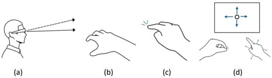 Gaze input is an intuitive interaction method that enables users to point to objects with minimal physical effort. It has been extensively utilized in both academic research and commercial applications. Recent research increasingly explores multimodal interactions that integrate gaze with other input modalities to enhance the overall user experience [,,,]. A notable example of this multimodal approach is the gaze + pinch interaction employed in devices such as Apple Vision Pro, where users direct their gaze toward an object and select or manipulate it through a pinch gesture.