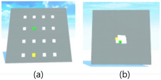 The first experiment compared the traditional gaze + pinch technique with ITap’s manual mode, focusing on pointing accuracy and speed. Conducted in a virtual reality (VR) environment, participants visually tracked changes in target objects, objects under gaze, and selected objects. The experimental setup consisted of a virtual wall measuring 11 m × 9 m, with targets arranged in a structured 4 × 4 grid. Each target measured 0.5 m × 0.5 m and was placed 2.3 m away from each corner of the wall, maintaining 1 m spacing between adjacent targets (Figure 4a).