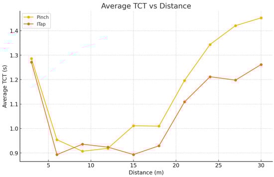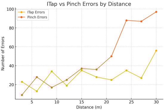 At medium distances (9 to 18 m), performance discrepancies between ITap and gaze + pinch became significantly more pronounced. The gaze + pinch method’s performance notably deteriorated, with average selection times increasing sharply from 1.80 s up to 2.78 s as distance increased. Correspondingly, the error rates for gaze + pinch also demonstrated a marked rise, escalating from 4.8% to 12.3%. This performance decline can be primarily attributed to the reduced accuracy of gaze tracking at intermediate distances, necessitating frequent gaze adjustments and repeated corrective pinch gestures, thereby negatively impacting overall user efficiency.
