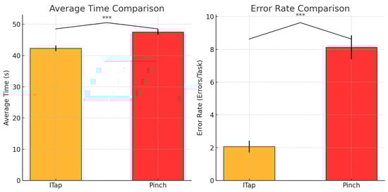 The ITap method demonstrated significantly faster target selection times and lower error rates compared to the Pinch method (Figure 8). ITap reduced execution time by 11%, with an average of 42.31 s (SD = 3.40) compared to 47.52 s (SD = 3.36) for Pinch. An independent samples t-test confirmed this difference as statistically significant (t = −4.15, p < 0.001). Regarding error rates, ITap had an average error rate of 2.07 (SD = 1.33), significantly lower than the Pinch method’s average of 8.13 (SD = 2.80), as confirmed by an independent samples t-test (t = −7.53, p < 0.001).