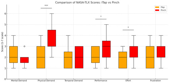 Following the completion of the scrolling and swipe tasks using both the ITap and Pinch interaction methods, we conducted independent t-tests to compare the results of the NASA-TLX evaluations across various dimensions (Figure 9). The analysis revealed statistically significant differences between the two methods in terms of Physical Demand, Performance, and Effort. Physical Demand: The Pinch method imposed a significantly higher physical burden on the participants than the ITap method (t = −3.83, p < 0.001). This suggests that the Pinch method requires greater physical exertion from users than the ITap method. Performance: ITap was rated significantly higher in terms of performance (t = −2.33, p = 0.027), indicating that ITap enables more effective task completion. Effort: The ITap method required significantly less effort than the Pinch method (t = −2.30, p = 0.029), indicating that ITap requires less energy from users to complete the same tasks.