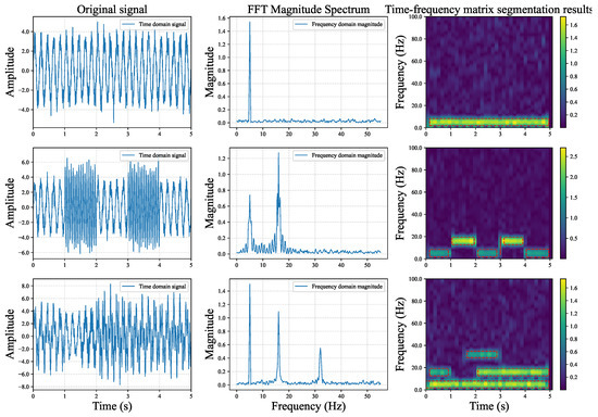 Specifically, the dataset contains 200 single-frequency signal samples and 800 multi-frequency signal samples, totaling 1000 samples. Each sample consists of 1000 data points. The total number of signal components K varies between 1 and 5 to simulate signals of different complexities. The fundamental frequency ranges from 0 to 50 Hz, and varies between 1 and 5 to ensure diversity in signal strength. The phase follows a uniform distribution to ensure randomization of the signal component phases. The time window parameters and follow a uniform distribution to control the activation duration of the signals, ensuring that different signal components are distributed randomly along the time axis. The noise intensity coefficient is set to and to adjust the noise level of the signals, simulating signal interference in real-world environments. The continuous signals are sampled at 200 Hz. To quantify the performance of the time–frequency matrix segmentation algorithm, the changes in the time–frequency matrix corresponding to each new frequency component added to the original data are recorded during the construction of the dataset. This information serves as the ground truth, which includes the main energy of the original data and is used for subsequent experimental validation and algorithm evaluation.