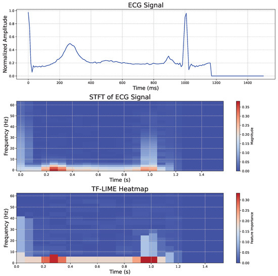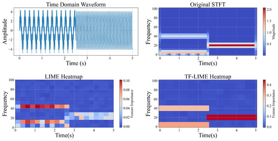 - Proposal of the TF-LIME algorithm integrating multiple techniques. This paper integrates key technologies such as the short-time Fourier transform (STFT) [27], the TFHS segmentation algorithm, LIME, and Inverse STFT (ISTFT) to propose the TF-LIME algorithm, constructing an efficient time–frequency domain explanation framework for time series. This method not only retains the model-agnostic advantages of LIME but also enhances its interpretability and semantic consistency in time–frequency analysis scenarios.