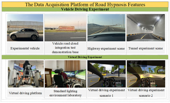In this study, the vehicle and the virtual driving experiment are used to collect data, respectively. The vehicle driving experiment is carried out at the National Intelligent Network Innovation Center in Zhaoyuan City, Shandong Province, China-Vehicle-Road Cloud Integration Test Demonstration Base. The virtual driving experiment is carried out on the virtual driving experimental platform in the laboratory. The experimental vehicle used in the actual vehicle test, the actual vehicle driving experiment, and the virtual driving experiment environment are all shown in Figure 1. The data acquisition platform of road hypnosis features is shown in Figure 1. The tunnel is designed as a two-way, two-lane urban trunk road, with the left and right lines separated. The cross-section of the main tunnel is oval. There is a monotonous and closed straight-line driving distance. The highway is a two-way, four-lane road. The driving environment is relatively singular.