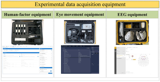 The experimental equipment includes multi-functional comprehensive experimental test vehicles, virtual driving experimental platforms, EEG equipment, eye movement equipment, human-factor equipment, phones, laptops, and video recorders, etc. The experimental equipment is shown in Figure 2, which includes the display diagram of EEG equipment, eye movement equipment, and human-factor equipment. The EEG equipment used is Enobio Dx EEG data acquisition equipment. The manufacturer of this equipment is Neuroelectrics. This is a company based in Barcelona, Spain. It can collect eight channels of EEG data. The eye movement equipment used is a See Glasses eye tracker. Its specific parameters are shown in the table.