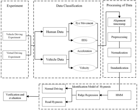 Driver factors are the main cause of road traffic accidents. For the research of automotive active safety, an identification method for road hypnosis of a driver of a car with dynamic human–vehicle heterogeneous data fusion calculation is proposed. Road hypnosis is an unconscious driving state formed by the combination of external environmental factors and the psychological state of the car driver. When drivers fall into a state of road hypnosis, they cannot clearly perceive the surrounding environment and make various reactions in time to complete the driving task. The safety of humans and cars is greatly affected. Therefore, the study of the identification of drivers’ road hypnosis is of great significance. Vehicle and virtual driving experiments are designed and carried out to collect human and vehicle data. Eye movement data and EEG data of human data are collected with eye movement sensors and EEG sensors. Vehicle speed and acceleration data are collected by a mobile phone with AutoNavi navigation, which serves as an onboard sensor. In order to screen the characteristics of human and vehicles related to the road hypnosis state, the characteristic parameters of the road hypnosis in the preprocessed data are selected by the method of independent sample T-test, the hidden Markov model (HMM) is constructed, and the identification of the road hypnosis of the Ridge Regression model is combined. In order to evaluate the identification performance of the model, six evaluation indicators are used and compared with multiple regression models. The results show that the hidden Markov-Ridge Regression model is the most superior in the identification accuracy and effect of the road hypnosis state. A new technical scheme reference for the development of intelligent driving assistance systems is provided by the proposed comprehensive road hypnosis state identification model based on human–vehicle data can provide, which can effectively improve the life recognition ability of automobile intelligent cockpits, enhance the active safety performance of automobiles, and further improve traffic safety.