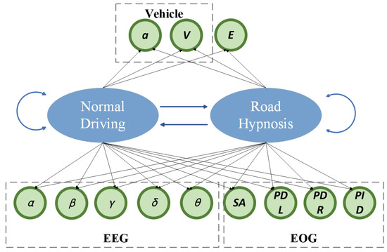 The combination of the hidden Markov model (HMM) and Ridge Regression is used to analyze multi-dimensional human and vehicle data to identify the driver’s road hypnosis. The hidden Markov model (HMM) is a probability model based on the Markov process used to describe an observation sequence generated by an implicit state sequence. Suppose there are two hidden states, which represent that the driver is in a road hypnosis state and a non-road hypnosis state, respectively. The goal of HMM is to infer the hidden state of each moment by observing data. The schematic diagram of the hidden Markov model is shown in Figure 4. The likelihood of road hypnosis versus normal driving is predicted by integrating vehicle data, eye movement data, and EEG data using a hidden Markov model (HMM), as illustrated by this diagram. In the vehicle box, is acceleration, and velocity. In the EEG box, alpha, beta, gamma, delta, and theta brain waves are shown. In the EOG box, SA is Gaze Velocity, PDL is Pupil Diameter Left, PDR is Pupil Diameter Right, and IPD is Inter Pupillary Distance.