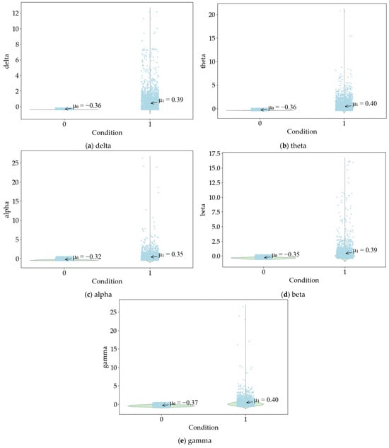 The independent sample t test results of EEG data show that the delta value is less significant than 0.05 in the Levin variance equivalence test. Therefore, the heteroscedasticity assumption is selected. The mean equivalence t test sig. (2-tailed) value is 0.000, t = 28.711. There is a significant difference in whether the delta is in a state of road hypnosis. The theta value is less significant than 0.05 in the Levin variance equivalence test. Therefore, the heteroscedasticity assumption is selected. The mean equivalence t test sig. (2-tailed) value is 0.000, t = 29.051. There is a significant difference in whether the theta is in a state of road hypnosis. The alpha value is less significant than 0.05 in the Levin variance equivalence test. Therefore, the heteroscedasticity assumption is selected. The mean equivalence t test sig. (2-tailed) value is 0.000, t = 24.885. There is a significant difference in whether the alpha is in a state of road hypnosis. The beta value is less significant than 0.05 in the Levin variance equivalence test. Therefore, the heteroscedasticity assumption is selected. The mean equivalence t test sig. (2-tailed) value is 0.000, t = 28.124. There is a significant difference in whether the beta is in a state of road hypnosis. The gamma value is less significant than 0.05 in the Levin variance equivalence test. Therefore, the heteroscedasticity assumption is selected. The mean equivalence t test sig. (2-tailed) value is 0.000, t = 29.621. There is a significant difference in whether Gamma is in a state of road hypnosis. The distribution of EEG data is shown in Figure 5. The mean values of delta, theta, alpha, beta, and gamma in the road hypnosis state are 0.39, 0.40, 0.35, 0.39, and 0.40, respectively. The mean values of delta, theta, alpha, beta, and gamma in the normal driving state are −0.36, −0.36, −0.32, −0.35, and −0.37, respectively.