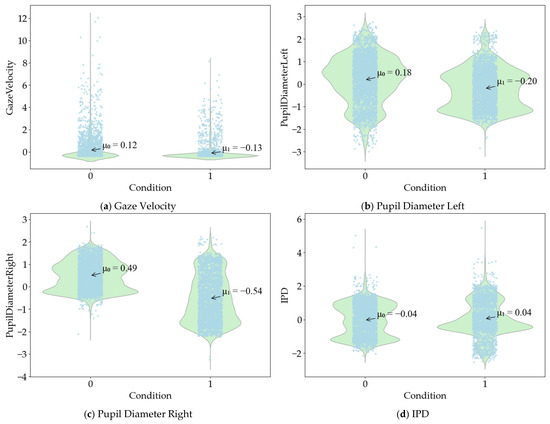 The independent sample t test results of eye movement data show that the Gaze Velocity value is less significant than 0.05 in the Levin variance equivalence test. Therefore, the heteroscedasticity assumption is selected. The mean equivalence t test sig. (2-tailed) value is 0.000, t = −9.722. There is a significant difference in whether the Gaze Velocity is in a state of road hypnosis. The Pupil Diameter Right value is less significant than 0.05 in the Levin variance equivalence test. Therefore, the heteroscedasticity assumption is selected. The mean equivalence t test sig. (2-tailed) value is 0.000, t = −43.440. There is a significant difference in whether the Pupil Diameter Right is in a state of road hypnosis. The Pupil Diameter Left value is less significant than 0.05 in the Levin variance equivalence test. Therefore, the heteroscedasticity assumption is selected. The mean equivalence t test sig. (2-tailed) value is 0.000, t = −14.631. There is a significant difference in whether the Pupil Diameter Left is in a state of road hypnosis. The IPD value is more significant than 0.05 in the Levin variance equivalence test. Therefore, the homoscedasticity assumption is selected. The mean equivalence T test sig. (2-tailed) value is 0.004, t = 2.898. There is a significant difference in whether the IPD is in a state of road hypnosis. The distribution of eye movement data are shown in Figure 6. The mean values of Gaze Velocity, Pupil Diameter Left, Pupil Diameter Right, and IPD in the road hypnosis state are −0.13, −0.20, −0.54, and 0.04, respectively. The mean values of Gaze Velocity, Pupil Diameter Left, Pupil Diameter Right, and IPD in the normal state are 0.12, 0.18, 0.49, and −0.04, respectively.