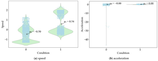 The independent sample t test results of vehicle data show that the speed value is less significant than 0.05 in the Levin variance equivalence test. Therefore, the heteroscedasticity assumption is selected. The mean equivalence t test sig. (2-tailed) value is 0.000, t = 44.698. There is a significant difference in whether the speed is in a state of road hypnosis. The acceleration value is less significant than 0.05 in the Levin variance equivalence test. Therefore, the heteroscedasticity assumption is selected. The mean equivalence t test sig. (2-tailed) value is 0.749, t = 0.320. There is no significant difference in whether the acceleration is in a state of road hypnosis. The distribution of vehicle data is shown in Figure 7. The mean values of speed and acceleration in the road hypnosis state are 0.54 and 0.00, respectively, and the mean values of speed and acceleration in the normal state are −0.5 and −0.00, respectively.