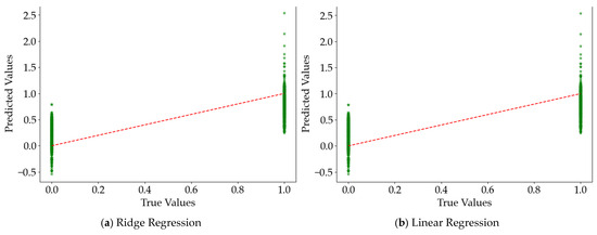 The result comparison plots for each regression model are shown in Figure 8. The green stars represent each observation, which is a scattered data point between two groups (0 and 1). The red dash line is the baseline that the model correctly predicted.