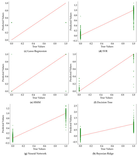 From the results in Table 7, the evaluation metrics of the regression models—Linear Regression, Ridge Regression, Lasso Regression, Support Vector Regression (SVR), Decision Tree, Neural Network, and Bayesian Ridge—are compared with those of the Hidden Markov-Ridge Regression model. It is shown that the constructed road hypnosis identification regression models all demonstrate good performance, with the Hidden Markov-Ridge Regression model performing the best. It achieves the lowest mean squared error (MSE) and Mean Absolute Error (MAE) among all models, as well as the highest coefficient of determination (R2) and explained variance (EV). Among the other regression models, the Decision Tree regression model also performs well, though slightly inferior to the Hidden Markov-Ridge Regression model. As shown in Figure 8, it can be seen that the HMM prediction has the most accurate values, and almost all 0 and 1 states (normal driving and road hypnosis) are correctly identified. It had fewer errors than the other models. It is demonstrated that the Hidden Markov-Ridge Regression model achieves the best fit between the true values and the predicted values.