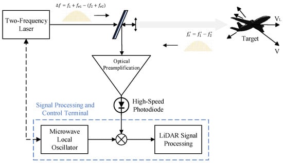 Considering that the frequency difference falls within the microwave frequency range, allowing it to be effectively detected by the photodetector and enabling subsequent data processing. Considering the relative radial velocity between the LiDAR and the target, which is much smaller than the speed of light (), the approximated Doppler shift expressions yield the echo frequencies and as follows: