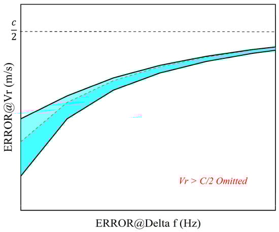 Figure 2 illustrates the proportional relationship between the laser frequency error () and the velocity measurement error (). With elevated target velocities ( significant), Doppler shifts () dominate the frequency shift, reducing the relative contribution of laser frequency instability (). This suppression of instability-induced errors strengthens with increasing velocity. In converse, diminished Doppler shifts cause laser frequency instability to dominate error propagation () under low-velocity conditions (). The measurement inaccuracies are directly amplified by frequency instability, reflecting the transition from signal-dominated to noise-dominated regimes. These relationships collectively underscore the critical role of laser frequency stability in achieving precise velocity measurements across all operational scenarios of the entire LiDAR system.