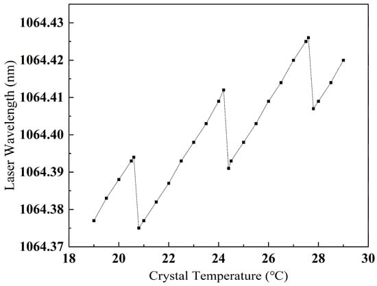 As previously discussed, the critical aspect of the laser lies in its frequency tuning performance which directly determines the temperature control range of the driver. Figure 4 presents the frequency curve of the output laser as the internal crystal temperature varies between 19 °C and 29 °C, revealing three distinct mode-hopping points at 20.6 °C, 24.2 °C and 27.6 °C. Based on the detection speed range requirement of −3 to 1 Mach for this coherent velocimeter LiDAR system, and considering a necessary margin for frequency tuning, the frequency difference range between the two lasers is established at −2 to 1 GHz. This necessitates a frequency tuning range of greater than 3 GHz for a single laser. By analyzing the temperature–frequency characteristic curve, the linear range of 24.4 °C to 27.6 °C is selected, with the center temperature for laser control set at 26 °C and the temperature control range defined as 24.5 °C to 27.5 °C. The corresponding theoretical frequency tuning range is approximately 8 GHz.