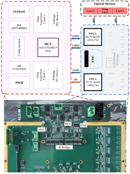 The overall architecture of the laser driver is illustrated in Figure 5. In this configuration, the driver board functions as an autonomous unit, incorporating an independent microcontroller that serves as the main control chip, enabling it to operate independently. The FPGA-based data acquisition and processing board, meanwhile, is tasked not only with collecting and processing data from the LiDAR system but also with overseeing the control and the status of the driver board.