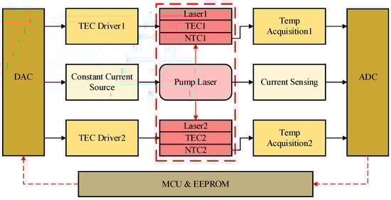 The hardware system architecture of the laser driver is depicted in Figure 6. It comprises six primary components: a main control and storage module, Analog-to-Digital Converter (ADC) and Digital-to-Analog Converter (DAC) for parameter setting and data acquisition, two TEC drivers, two Negative Temperature Coefficient (NTC) resistance temperature sensing circuits, a constant current source, and its corresponding current sensing circuit. The power supply module is omitted from the figure for clarity.