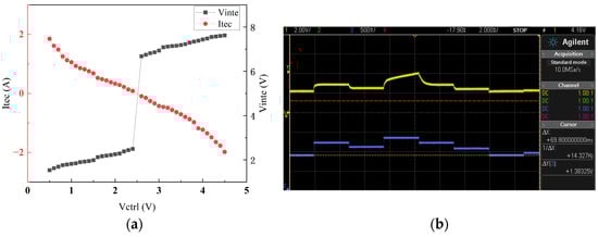 By setting the reference voltage to the midpoint of the DAC output range, a linear correspondence between the control voltage and the current powering TEC is achieved. Ideally, the control voltage, integrator output voltage, inverter output voltage, and TEC current exhibit a linear relationship. However, practical curves may deviate due to parameters such as MOSFET threshold voltages and operational amplifier offset voltages. The measured voltage–current curve is shown in Figure 8a. Figure 8b demonstrates that the integrator output voltage changes smoothly with control voltage adjustments, ensuring proper H-bridge operation.