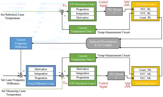 Recent advancements in laser driver design have demonstrated significant progress in temperature regulation and current stability. Li et al. (2018) introduced a novel low-noise, low-power laser driver with high modulation bandwidth integrating Hall–Libbrecht current control and ADN8834-based temperature stabilization [20]. The system demonstrated 523 ppm/°C temperature coefficient, ±0.0052 °C stability, and achieved <11.5 ppm CO2 and <0.124 ppm C2H2 detection limits via absorption spectroscopy. He et al. (2019) proposed a novel semiconductor laser power stabilization system utilizing a Microcontroller Unit (MCU) as the primary control unit, with LT3080 from ADI serving as the core component to establish a voltage-controlled constant current source [21]. The system integrates an operational amplifier and resistor–capacitor network to construct a power control loop, incorporating a neural network-based PI control algorithm to achieve short-term stable power output for semiconductor laser diode (LD) with <1 W output power and <1% long-term power stability. Zhao et al. (2022) developed a semiconductor laser current driver and temperature control system employing an STM32 microcontroller as the central processing unit [22]. The system features an operational amplifier and N-MOS transistor-based constant current source, implements a fuzzy PID-control algorithm and utilizes MAX1968 from ADI for thermoelectric cooler (TEC) driving. This configuration enables linear adjustment of output drive current from 0 to 100 mA with ±0.01 mA precision and ±0.005 °C temperature control accuracy. Gao et al. (2023) presented a semiconductor laser drive circuit consisting of an operational amplifier and power transistor for current regulation, coupled with MAX1978-based TEC control circuitry [23]. The system employs PID control to maintain a constant temperature, achieving an output wavelength standard deviation of 0.0002. Yu et al. designed a semiconductor laser driver circuit using field programmable gate arrays (FPGA) as control chips. The temperature control and feedback circuit use high-speed MOSFET as the switching device to drive the laser diode and TEC driving is achieved through ADN8834 and the fuzzy PID algorithm. The driver circuit achieves ±0.005 °C temperature control accuracy and ± 2 pm laser wavelength stability [24]. In general, most existing temperature control solutions rely on commercial off-the-shelf TEC driver ICs optimized for low-voltage applications, which become inadequate when driving high-voltage TECs integrated within airborne LiDAR systems. Furthermore, traditional approaches focusing solely on laser temperature regulation cannot inherently guarantee stable optical frequency output, necessitating complex calibration procedures, which greatly intensify system software complexity. Moreover, most current laser drivers prioritize singular performance factors such as temperature control accuracy, neglecting specific domain requirements of coherent LiDAR systems, resulting in a lack of operational adaptability and integration capability. Critically, the commonly used single-stage PID-control algorithm, which is effective for low-inertia, fast-response systems, exhibits inherent limitations in high-inertia, slow-response environments typical of airborne platforms, tending to result in control instability. To address these challenges, we propose a specialized control framework featuring a compact hardware design tailored for spatial constraints, a temperature cascade PID-control algorithm to accommodate high-inertia thermal environments, and dual-laser frequency difference regulation for simplified system architecture while maintaining precise frequency adjustment. These integrated implementations represent a pioneering systematic investigation into laser driver solutions specifically designed for dual-frequency coherent airborne LiDAR applications, overcoming hardware integration barriers and the accuracy limitations of temperature control using a comprehensive and cohesive design philosophy.