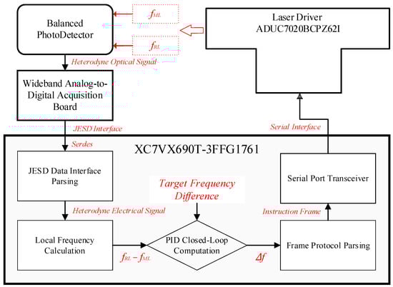 As shown in Figure 13, the TEC-controlled LD adjusts its output frequency by varying the internal crystal temperature. The optical frequency of the reference laser () and the measuring laser () are coherently mixed in an optical coupler, generating a heterodyne beat signal detected by a balanced photodetector optimized for high SNR due to dominant local oscillator power. The analog signal is digitized by an FMC Wideband RF Transceiver board and transmitted to an FPGA via JESD-protocol interfaces. Post-decoding, the system extracts the mixing center frequency () and down-converted I/Q time-domain signals. Applying FFT to the I/Q data yields a signed frequency offset (), enabling reconstruction of the local frequency as for ultra-wide-range signal monitoring. The FPGA-embedded PID controller computes the real-time desired frequency offset setpoint, which is frame-formatted and communicated to the laser driver, achieving closed-loop frequency offset control. This integrated system demonstrates precise frequency stabilization and dynamic range enhancement through coherent optical mixing and digital signal processing.