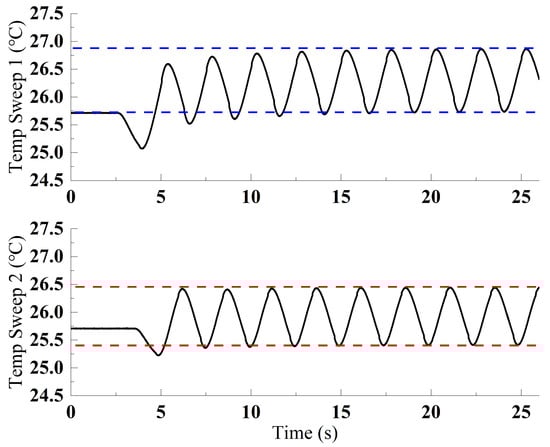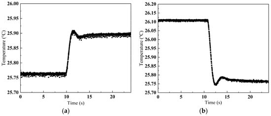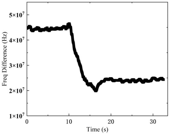 From the perspective of the output voltage, despite the adopted measures, the resistance is not strictly symmetrical around the center temperature. Additionally, temperature calibration is typically required when using NTC thermistors for accurate temperature measurement [29]. However, in the practical application of this study, only the constant frequency difference between the two lasers, i.e., the constant temperature difference, needs to be maintained. Therefore, it is unnecessary to consider whether the temperature and frequency of a single laser strictly matches. The temperature data collected here are merely relative values. This dual-laser frequency–temperature compensation mechanism significantly alleviates hardware design constraints and software computational burdens.