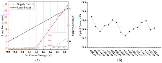 Under ambient conditions of 15 °C, the pump laser current was modulated via high-precision voltage control of a constant current source. The resultant laser power scaling with current injection is illustrated in Figure 18a, revealing the following: