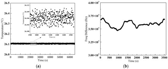 (a) Stabilized RL temperature variation; (b) stabilized frequency difference variation.