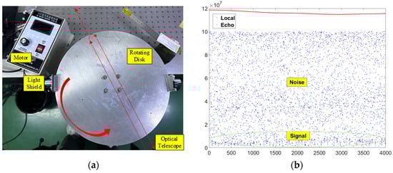 To evaluate the system performance, a rotating disk apparatus is employed under a laboratory environment to simulate a dynamic target scenario as shown in Figure 21. The experimental setup involved directing the output laser beam toward a metallic light shield mounted on the rotating disk, thereby creating intermittent target reflections analogous to moving objects. The disk is driven by a motor operating at 1800 RPM, producing echo signals with approximately 100 pW power level. The dual-frequency architecture presents inherent technical challenges due to the wavelength-pump current dependency and exceptional thermal sensitivity of the laser. Without stringent temperature regulation, the detection reliability of the LiDAR system would be compromised by thermal-induced wavelength drift. The experimental results reveal discernible velocity tracking profiles despite substantial noise components, which are attributed to the limited target size of the metallic light shield causing sporadic laser–target interactions.