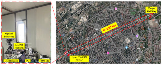 Given the current experimental limitations, this study prioritized static-ranging experiments to evaluate the LiDAR system performance as illustrated in Figure 22. The experiment was conducted on a sunny afternoon with good visibility, under ambient conditions featuring atmospheric pressure of 1009 hPa, relative humidity of 42% and good air quality. The outdoor ambient temperature is approximately 32 °C, while the LiDAR system was maintained at a controlled room temperature of 25 °C. The target selected was a stationary building facade positioned 2.73 km away (exhibiting negligible Doppler shift). Employing the LiDAR system, target distance measurements were acquired over a 0.5 s data processing interval. The demonstrated novel integrated a dual-laser control system incorporating a laser driver, FPGA control module and data acquisition/processing terminal. This system ensured that echo signals remained within the detector bandwidth, facilitating reliable and consistent target information retrieval.