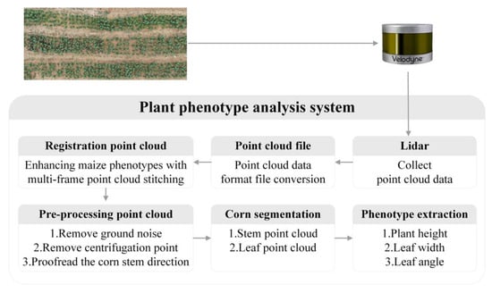 The architecture of our proposed plant phenotype system is shown in Figure 1. Taking maize plants as the research object, the PH, LW, and LA of maize were measured. Firstly, VLP-16 lidar was used to collect the three-dimensional point cloud data of maize plants during the middle and late growth stages. The specifications of VLP-16 lidar (Velodyne, San Jose, CA, USA) are listed in Table 1. Then, to enhance the phenotypic information of maize plants, a point cloud registration method is introduced to fuse the information from multiple frames. After that, the ground points and other outliers are filtered to obtain the point clouds of the plant area of interest. Finally, point cloud data processing methods are proposed for the automatic measurement of PH, LW, and LA of maize. To evaluate the performance of the proposed system, the automatic measuring results are compared with manually measured PH, LW, and LA values.