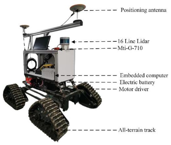A VLP-16 lidar (Velodyne) was used to collect the three-dimensional point cloud data of maize plants in the middle and late stages. In addition, the VLP-16 lidar was installed on top of a self-made moving platform to collect the three-dimensional point cloud data of maize plants. The general configuration of the sensing platform is shown in Figure 3. At the top of the platform is a GNSS integrated navigation and inertial measurement unit for vehicle positioning and information tracking, and the middle of the platform is equipped with an embedded computer to store the collected field point cloud information. Moreover, to meet the driving requirements of different roads, the bottom of the platform is equipped with a triangular crawler wheel.